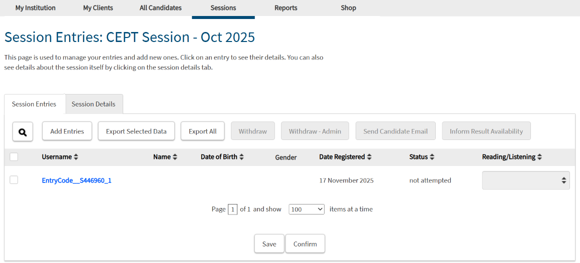 7. Localice la Sesión para la cual su candidato fue registrado y haga clic en el Nombre de la Sesión