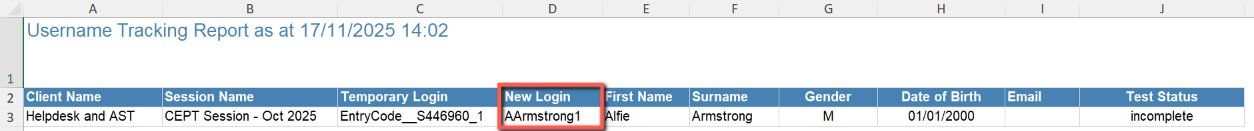 En el ejemplo a continuación, puede ver que el Nuevo Inicio de Sesión (Nombre de Usuario) del candidato es 'AArmstrong1'.